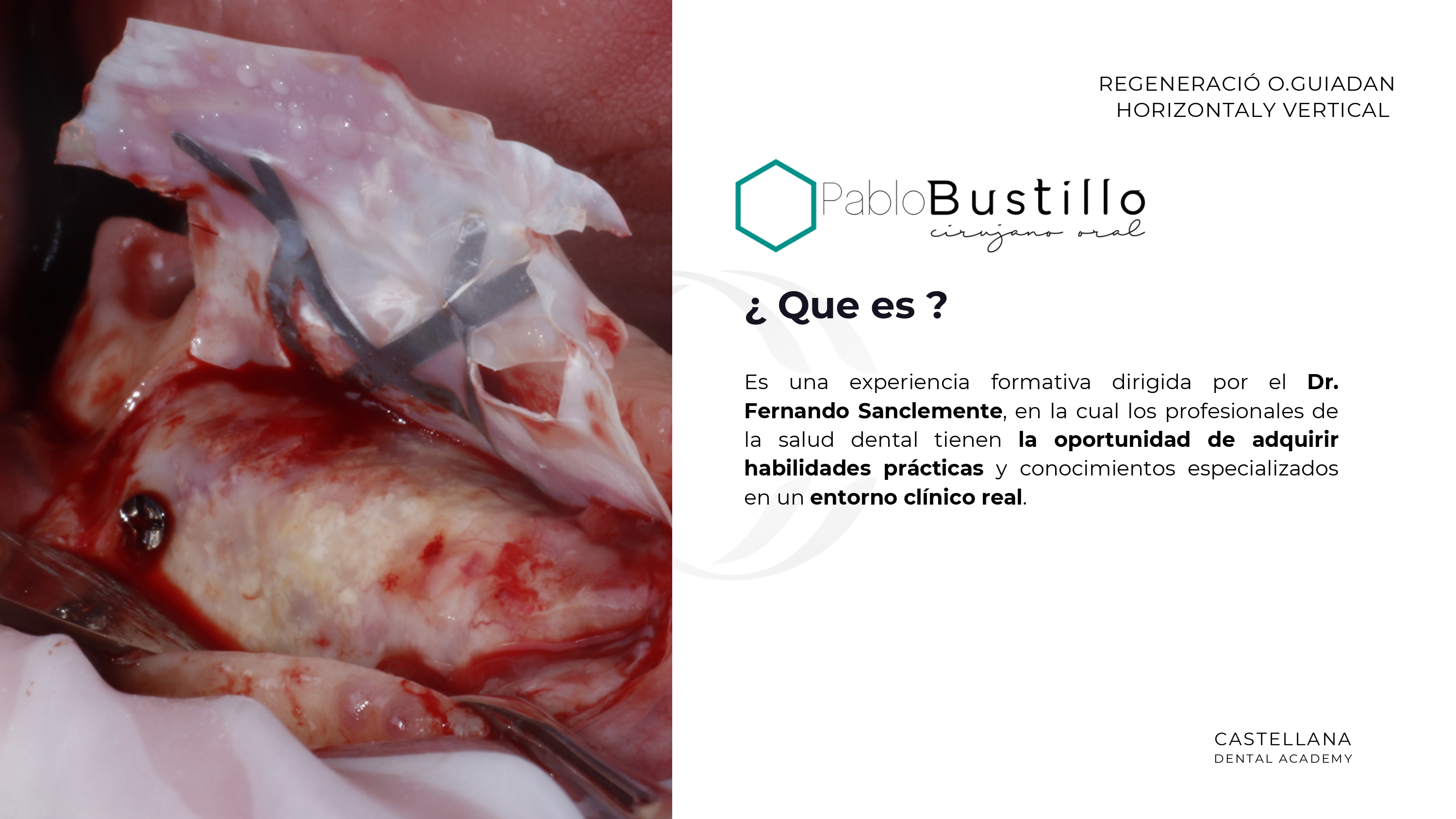 Es una experiencia formativa dirigida por el Dr. Pablo Bustillo, en la cual los alumnos tienen la oportunidad de adquirir habilidades prácticas y conocimientos especializados en un entorno clínico real sobre regeneración ósea guiada.