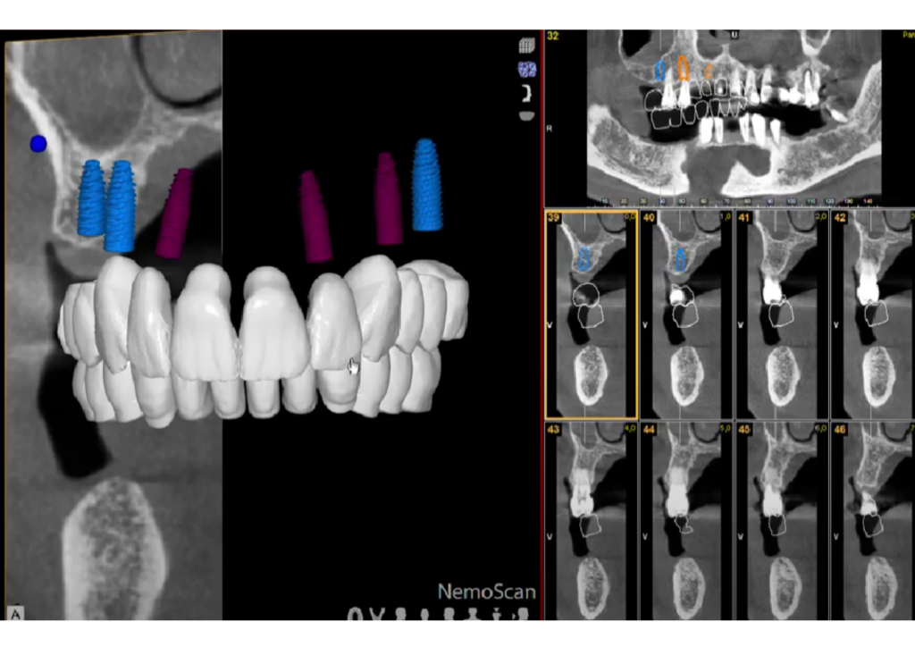 En la primera cita, realizamos un estudio, a través de un CBCT, fotografías y registros intraorales 3d. Con esta información, a través de un software de planificación de implantes, llevamos a cabo una simulación virtual de la futura posición de los implantes. Esto nos permite preparar con antelación una prótesis fija y una guía personalizada para la colocación de los implantes de manera totalmente precisa.
